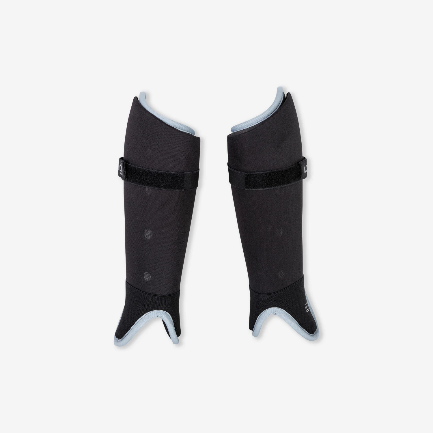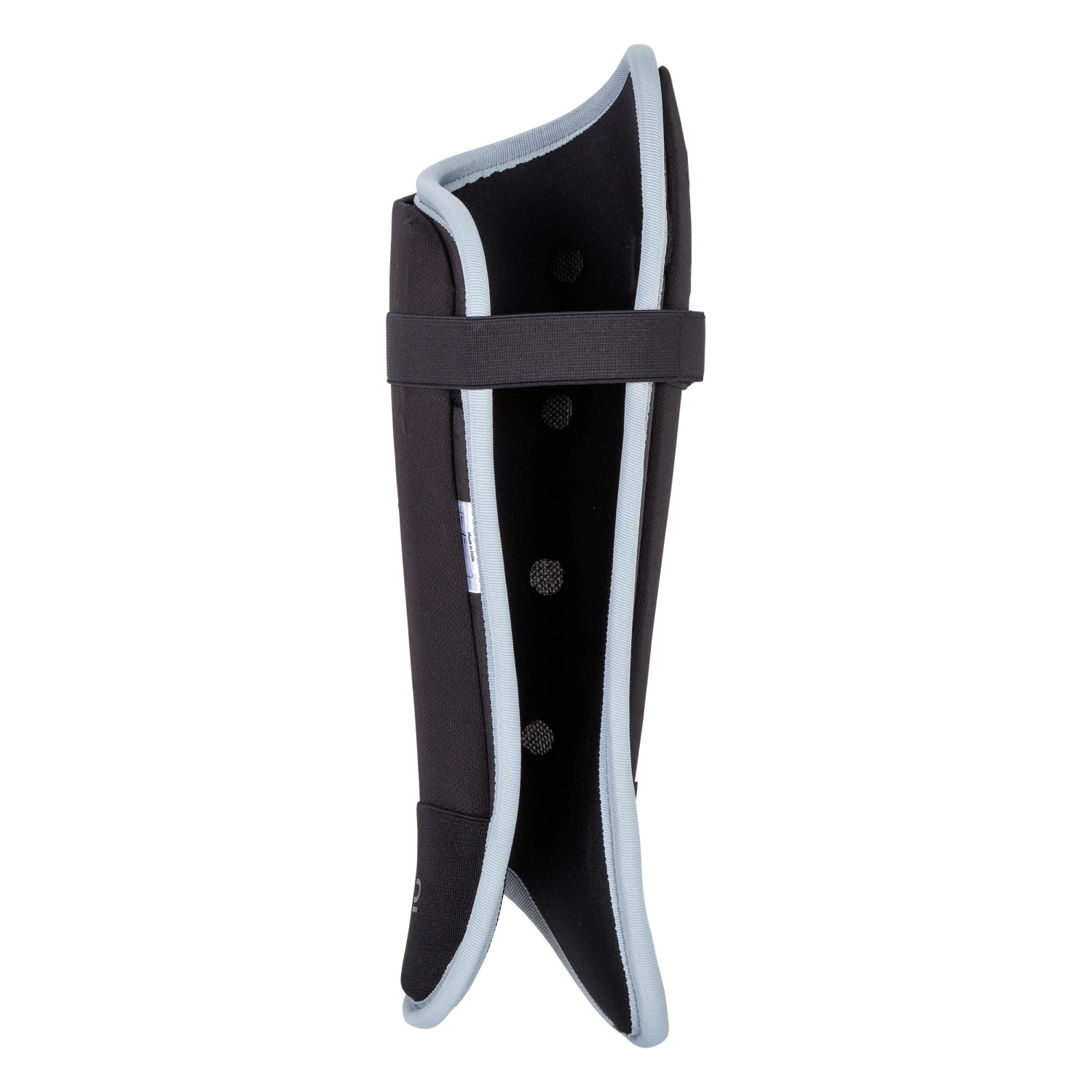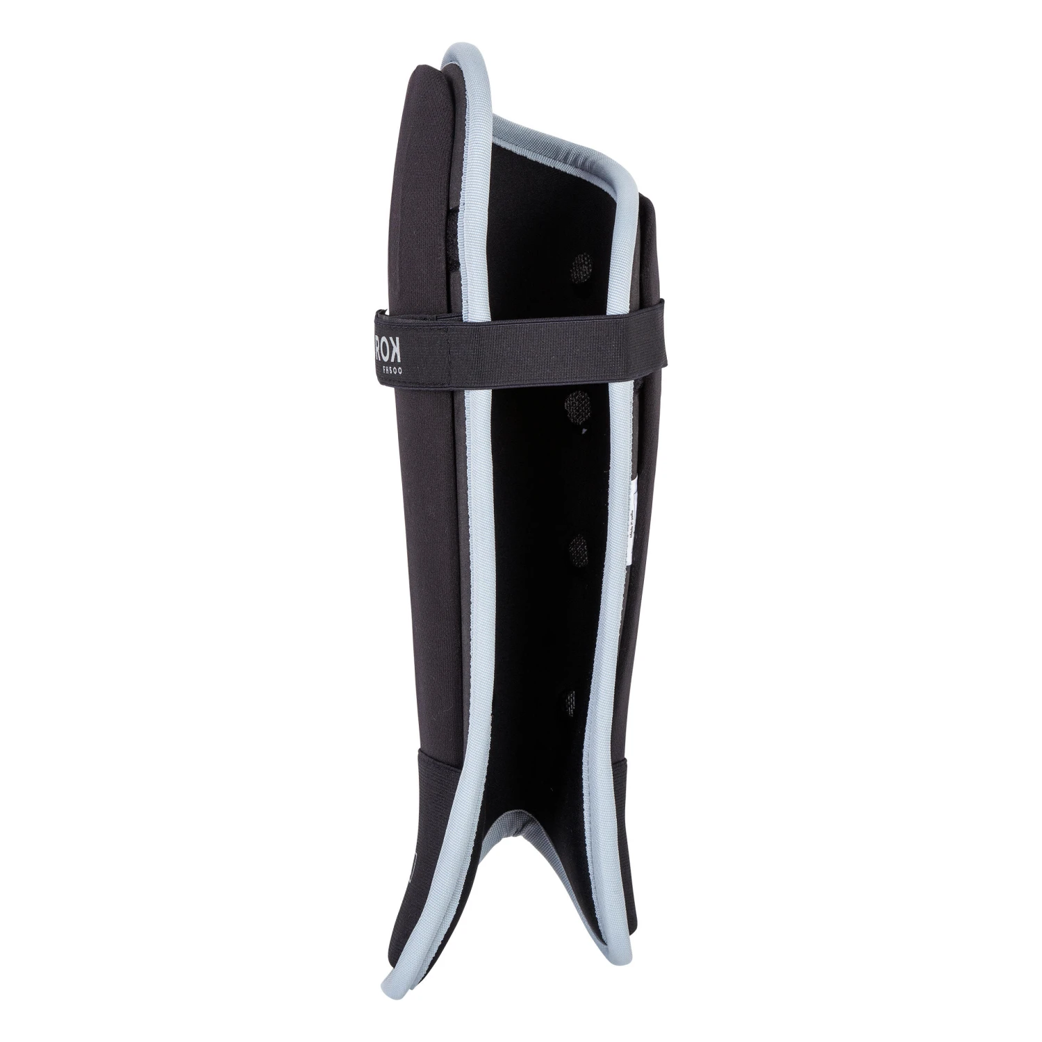 A field hockey shin pad features a moulded plastic plate that is generally lined with foam to absorb impacts.