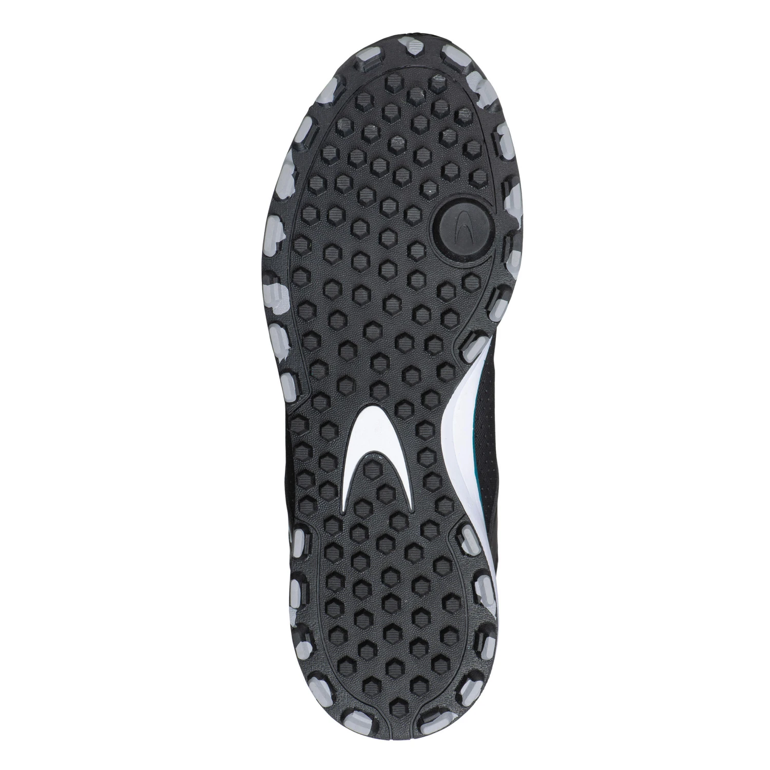 Outsole: moulded rubber with conical studs for grip. Long, thin studs at the edge of the sole to stabilise the foot. In the front of the sole, under the 1st metatarsal head, directional PAD for easier changes in direction. / Midsole: flexible EVA for cushioning. / The outsole covers the front of the toes. / Insole: flat foam.