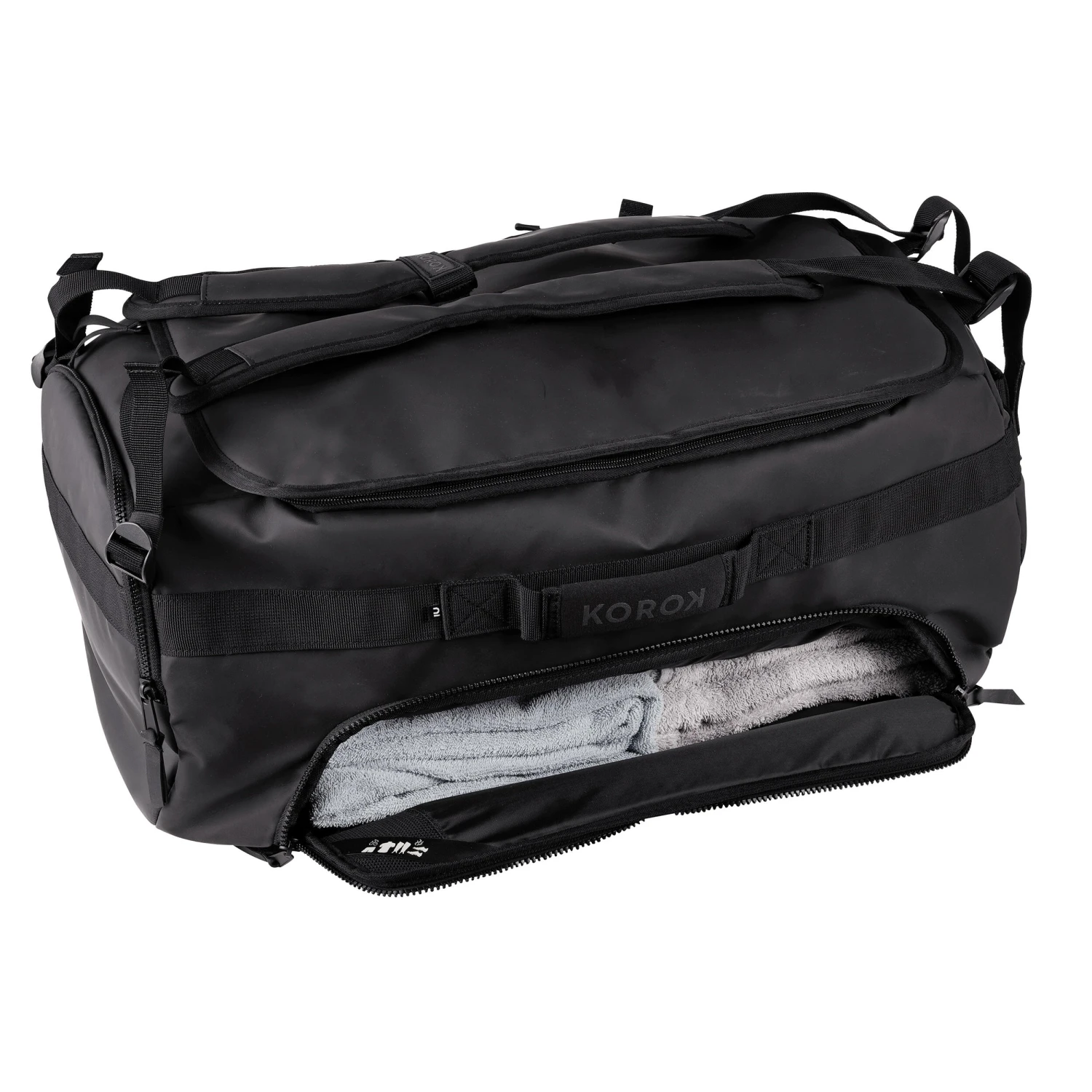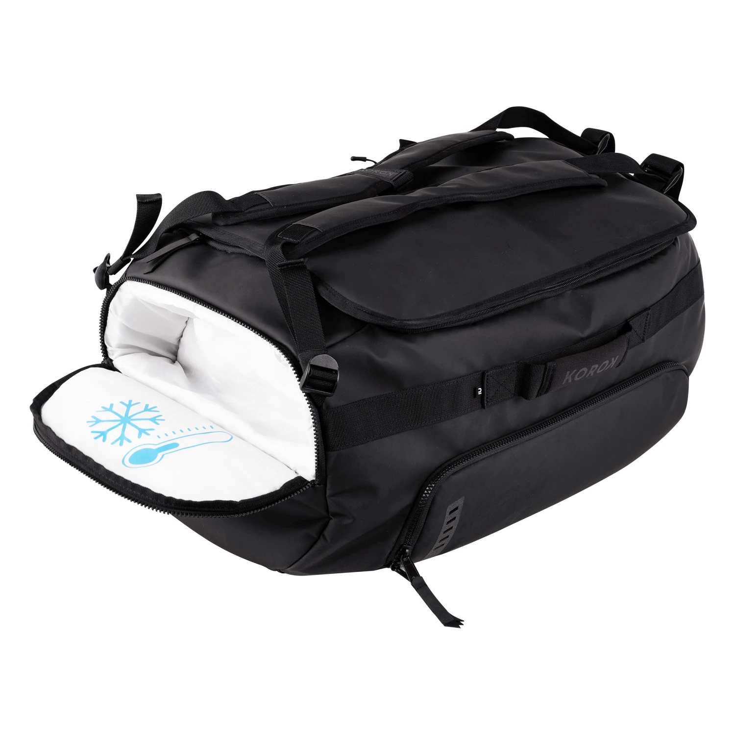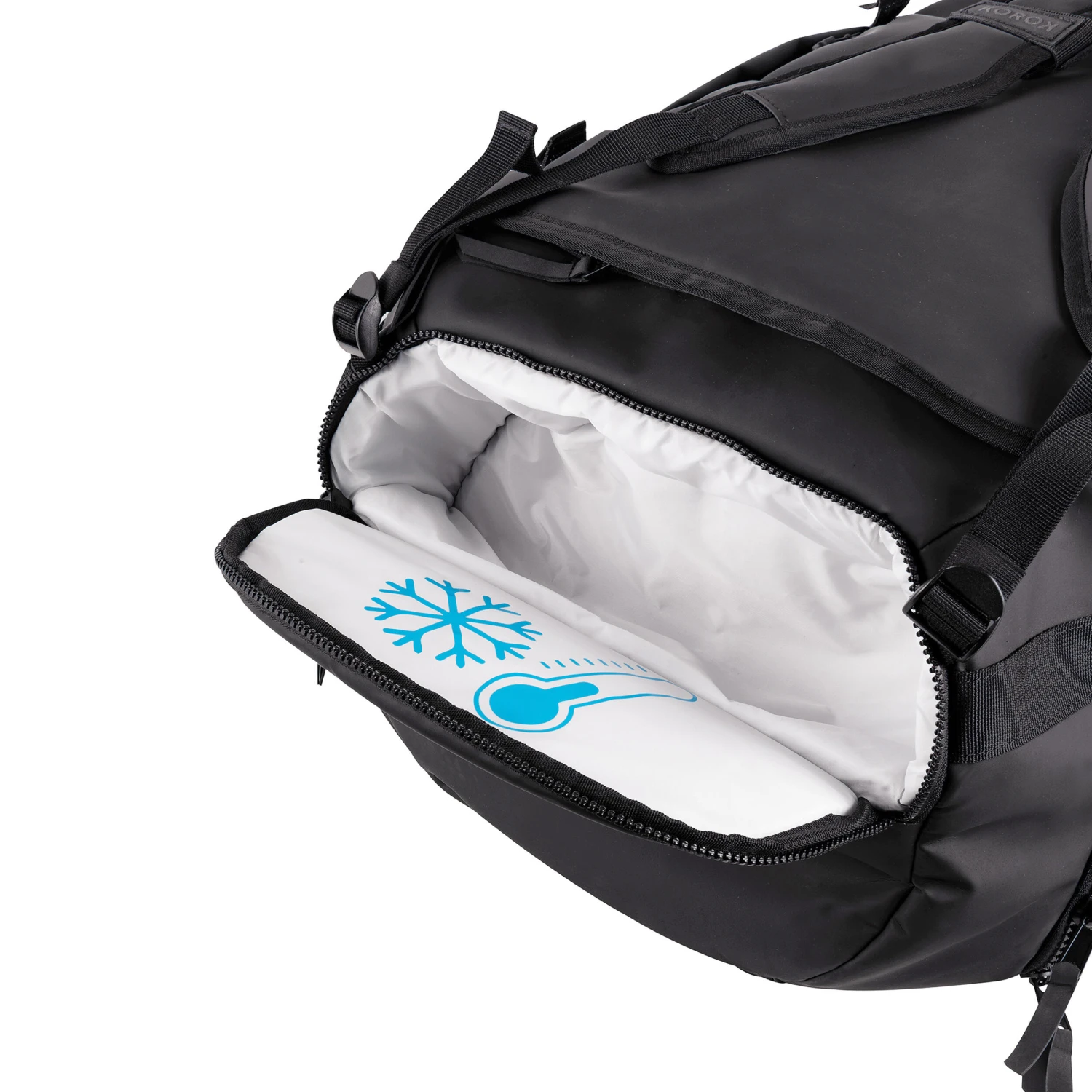 1 main compartment for your clean belongings at the top of the bag. This compartment’s flap contains 2 large, zip-up pockets. One is fully opaque, to contain odours from things like your gloves and mouthguard, while the other is mesh for things like your keys and wallet. In the bottom of the bag, there’s a compartment for shoes and damp kit. This compartment’s flap is ventilated. Insulated pocket for your flask and food.