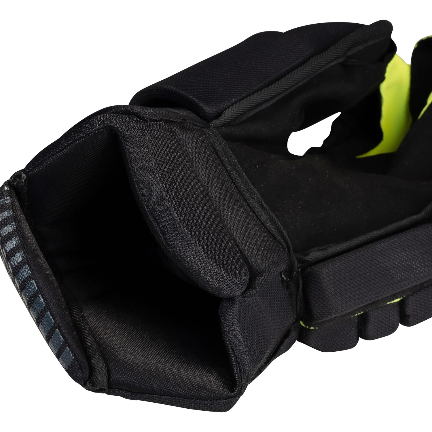 Gloves made of flexible peachskin fabric covered by articulated foam pieces (10 to 20 mm thick) on the back, the entire circumference of the wrist, and both sides of the outer fingers. A wide opening for easy dressing and removal. The palm is enclosed in peachskin fabric. This fabric, as well as the articulated fingers, allows a good grip on the stick.