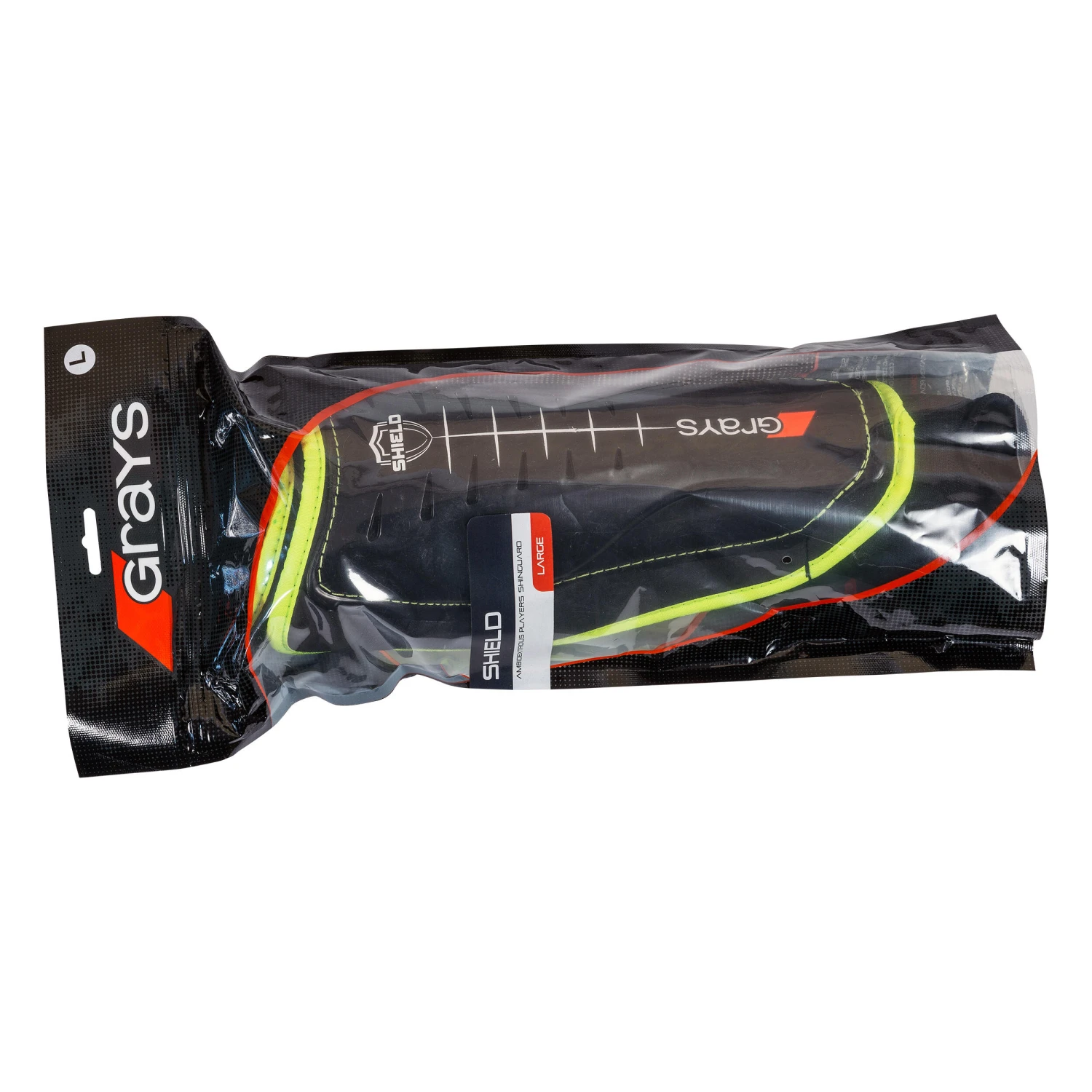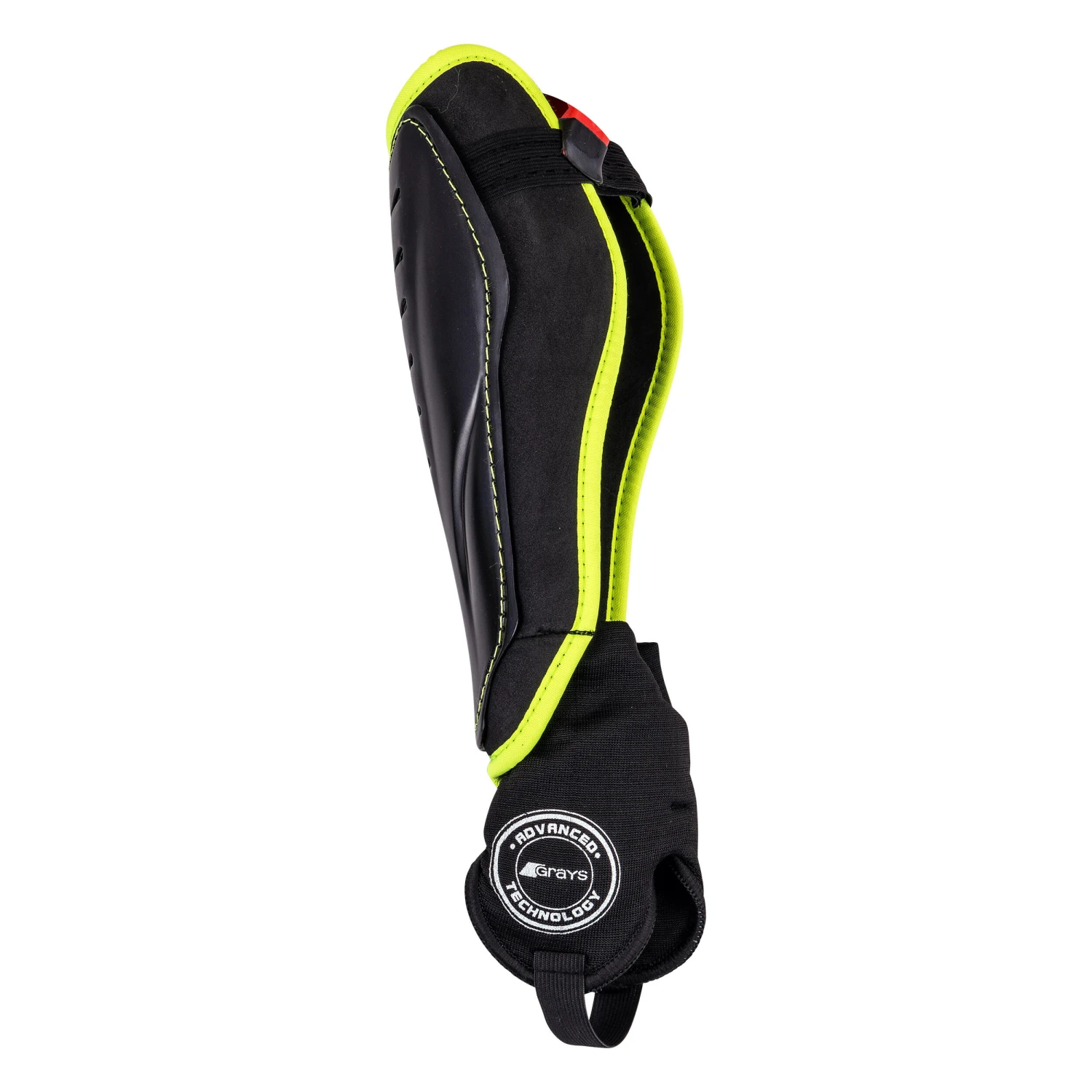A field hockey shin pad features a moulded plastic plate that is generally lined with foam to absorb impacts.