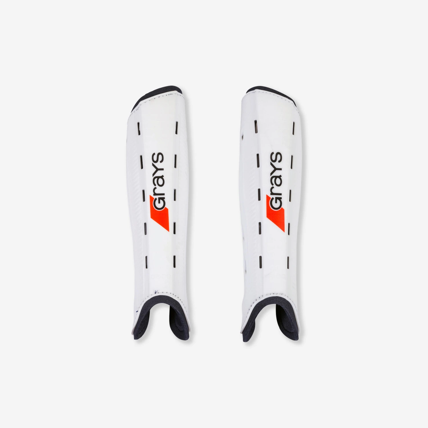 Hard polymer plastic shell covers the sides of the leg and ankles with a raised central spine. Lined with hard foam. There are holes for ventilation. The shell is moulded in a relatively closed position to keep the product in place on the leg (there are no elastic straps). Left/right specific.