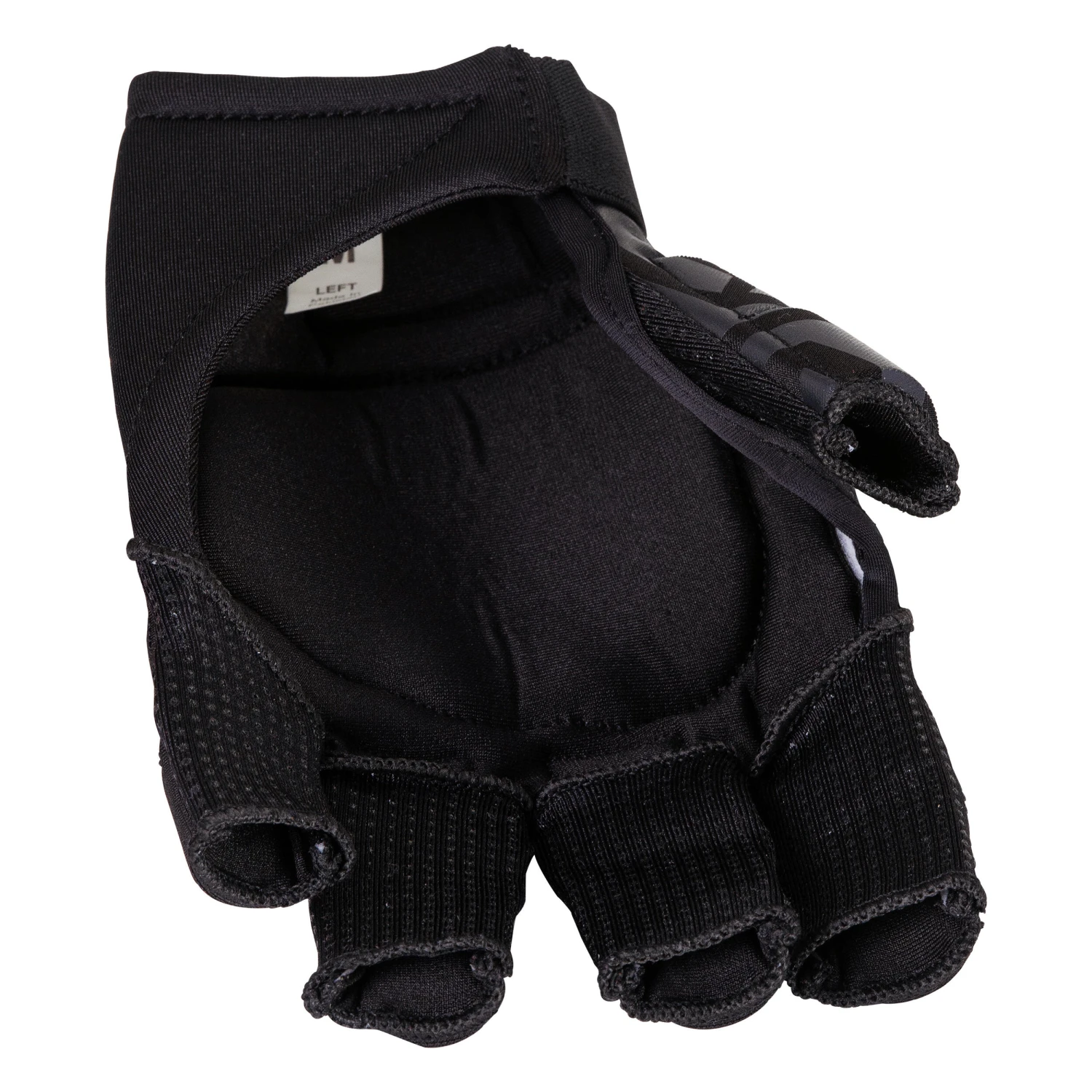 The protection over the thumb may only be in foam. The open palm lets you get a better feel on the grip while the inner fingers are usually covered with a tacky fabric.
