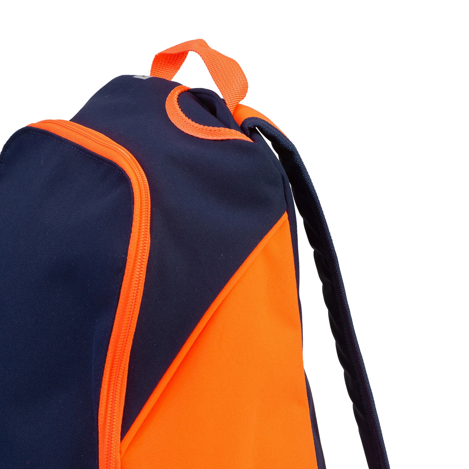 The bag stands in an upright position. The base is made from waterproof fabric that is resistant to wear. The rest is made from water-repellent fabric. 2 padded adjustable straps for carrying the bag. Foam back. Reflective designs on one strap and on the bag’s face. Handle for easily carrying and moving the bag. Mesh side pocket on the outside for a bottle. Mesh opening to vent the main compartment. External zips equipped with a large buckle. Reflective zones.