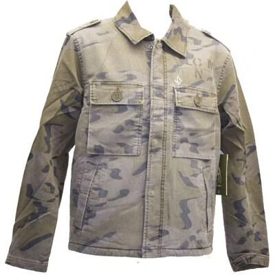100% Cotton Heavy Dobby waist length Military Camo Jacket with front pouch pockets. Rocking a full sherpa lining and Volcom scout screen print at the chestal area. Also has a stone wash…